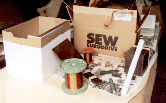 Unsere Teile z.B.: Draht (auf der grünen Rolle im Vordergrund und der roten Rolle im Hintergrund), Pertinax (z.B. das braune, holzartige, das links am Karton lehnt),